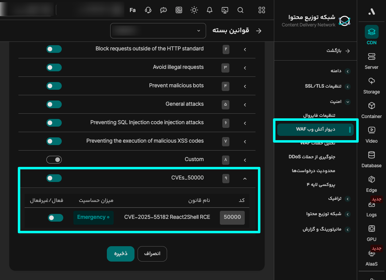۶- فعال کردن قانون حفاظتی CVE-2025-55182 React2Shell RCE