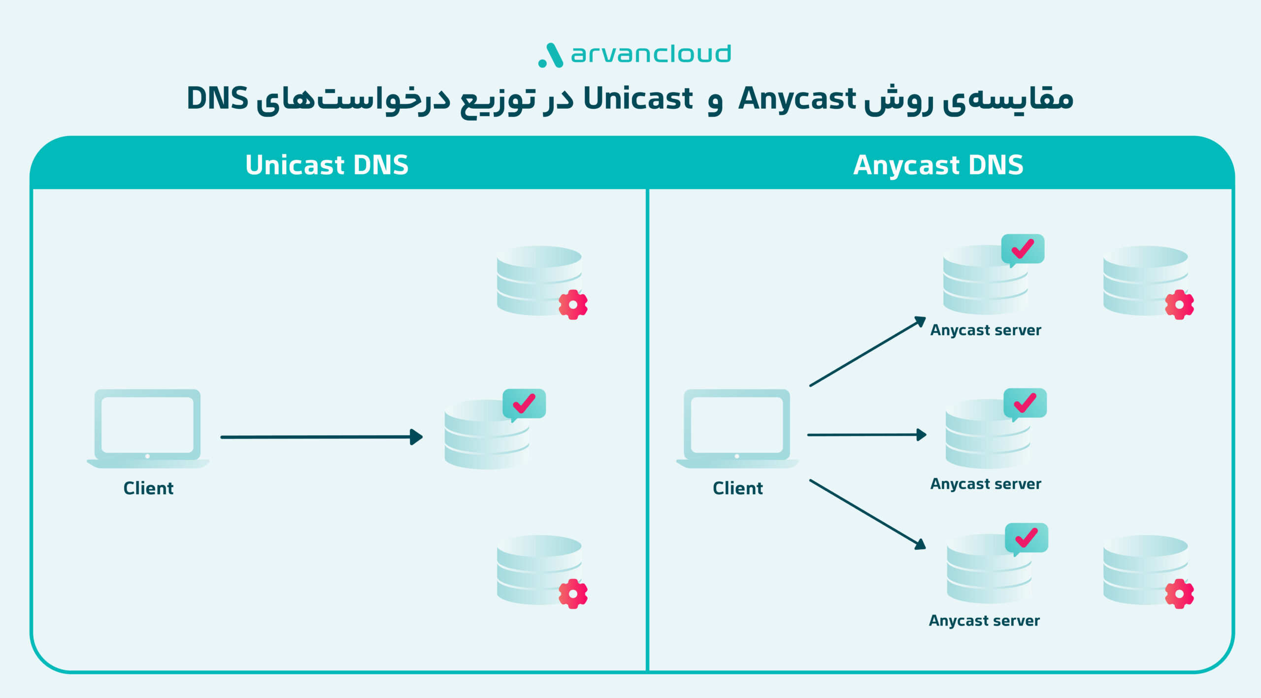 همان‌طور که در تصویر زیر می‌بینید برای نمونه در یک سرویس DNS با چند سرور مختلف در زمان استفاده از Unicast به هر سرور یک آدرس IP یکتا اختصاص داده می‌شود. در این حالت کاربران به سرورهای مختلف بر اساس IP هر یک از آن‌ها متصل شده و تمام درخواست‌های DNS را به آن می‌فرستد. اگر یکی از این سرورها دچار مشکل شود یا از نظر فاصله‌ی شبکه‌ای دور باشد، درخواست‌ها کندتر پاسخ داده می‌شود و حتا ممکن است که به‌طور کلی پاسخ داده نشوند. اما در بخش راست و در وضعیت Anycast چند سرور DNS مختلف در نقاط گوناگون شبکه یا کشورهای مختلف هستند که همگی این سرورها یک آدرس IP مشترک دارند. در این حالت، وقتی کاربر یک درخواست DNS می‌فرستد، ترافیک به نزدیک‌ترین سرور از نظر مسیریابی شبکه هدایت می‌شود.