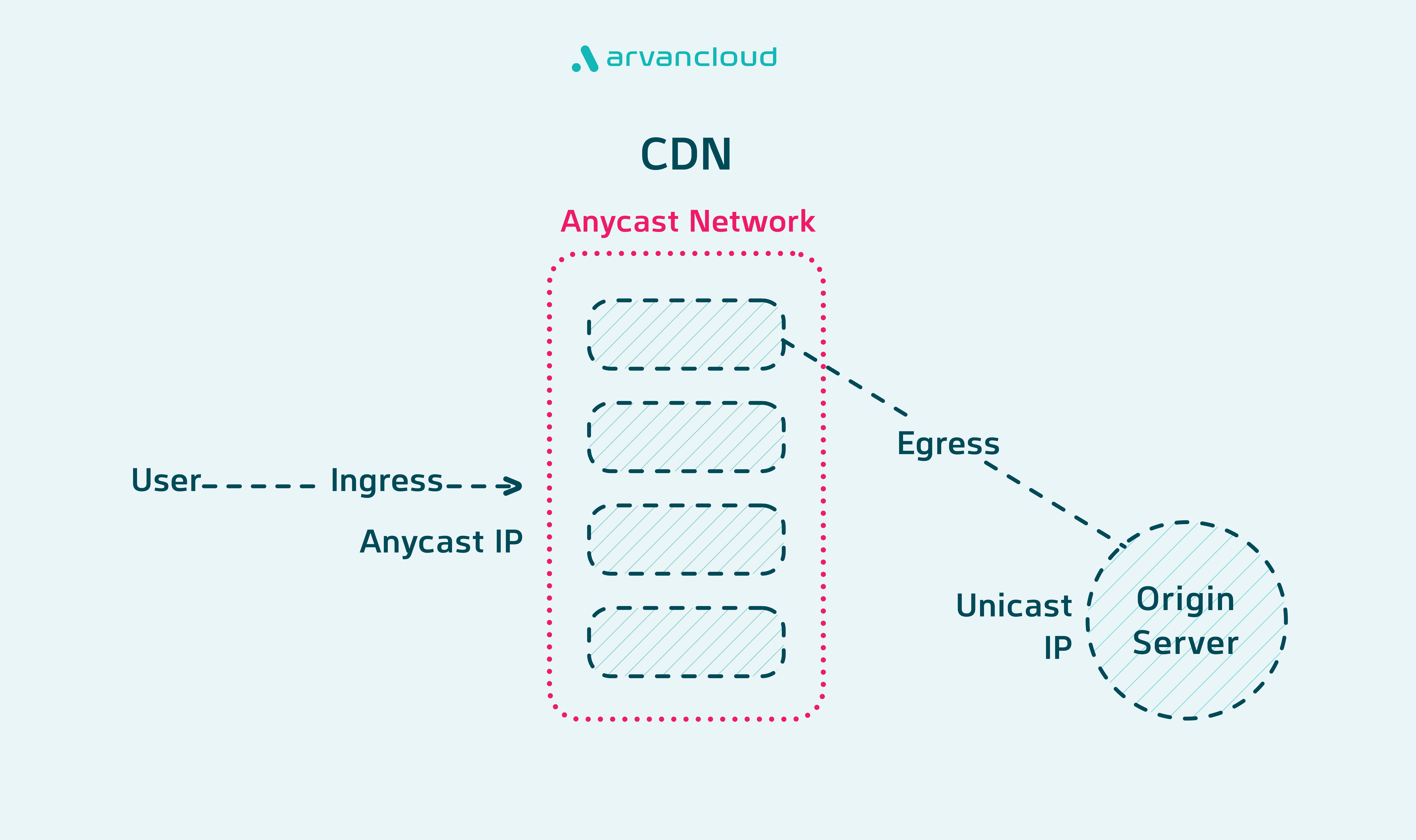 شبکه‌ی CDN ترافیک خروجی (Egress Traffic) خود را برای اتصال به سرورهای Upstream (سرور بالادستی)، از بازه‌ی آدرس‌های IP مربوط به Unicast خود ارسال می‌کند. این سازوکار به این معناست که وقتی کاربران به سمت شبکه‌ی CDN درخواست می‌فرستند، ورود ترافیک از طریق Anycast IP انجام می‌شود تا ترافیک به نزدیک‌ترین سرور هدایت شود، سپس این ترافیک برای رسیدن به سرورهای اصلی از IPهای اختصاصی هر یک از سرورها و پاپ سایت‌ها( PoP- Point of Present) استفاده می‌کند.