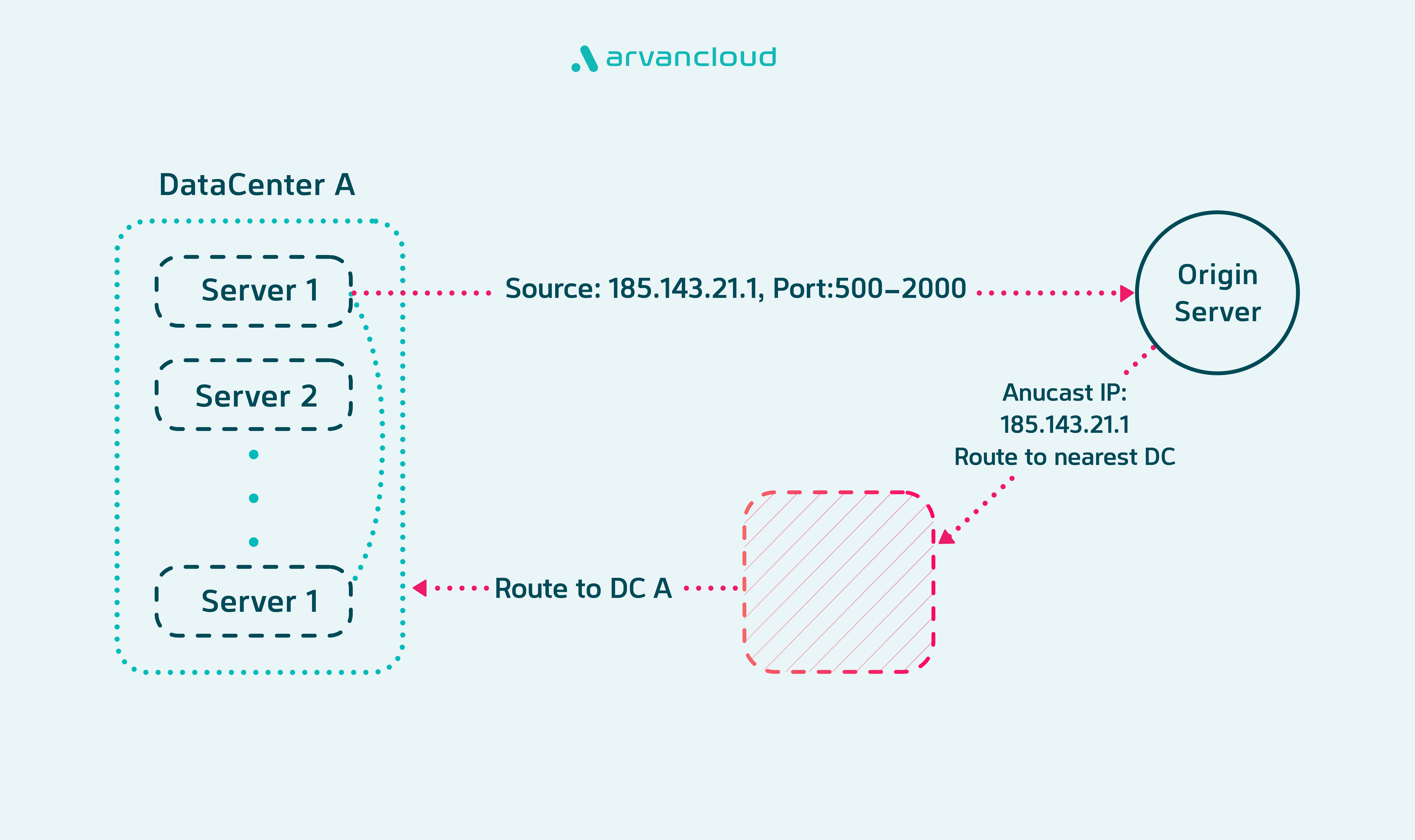 در چنین حالتی، زمانی که CDN می‌خواهد با سرورهای بالادستی (مانند سرور منبع محتوا یا Origin Server) ارتباط برقرار کند، از آدرس‌های Unicast استفاده می‌کند تا مسیر خروجی ترافیک مشخص، پایدار و ردیابی‌شونده باشد.